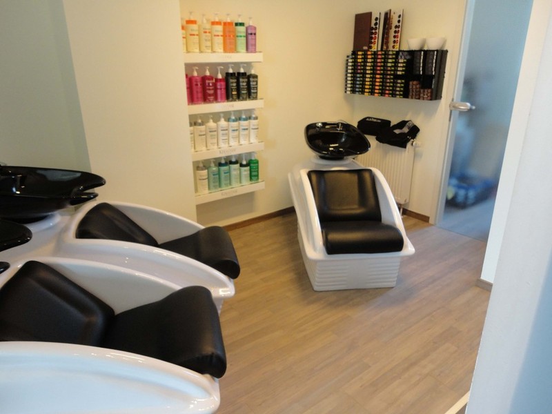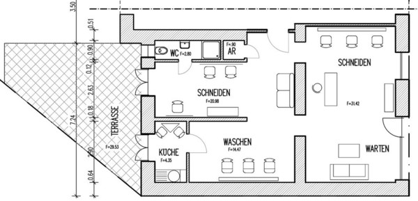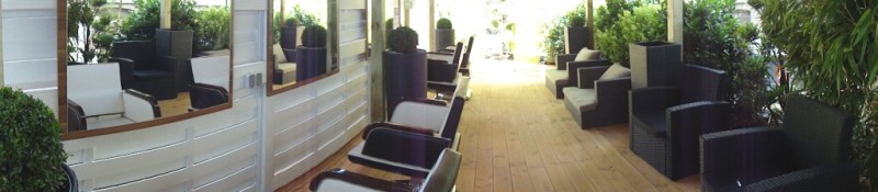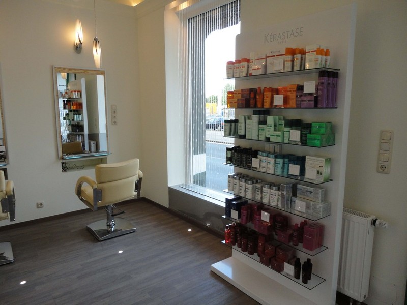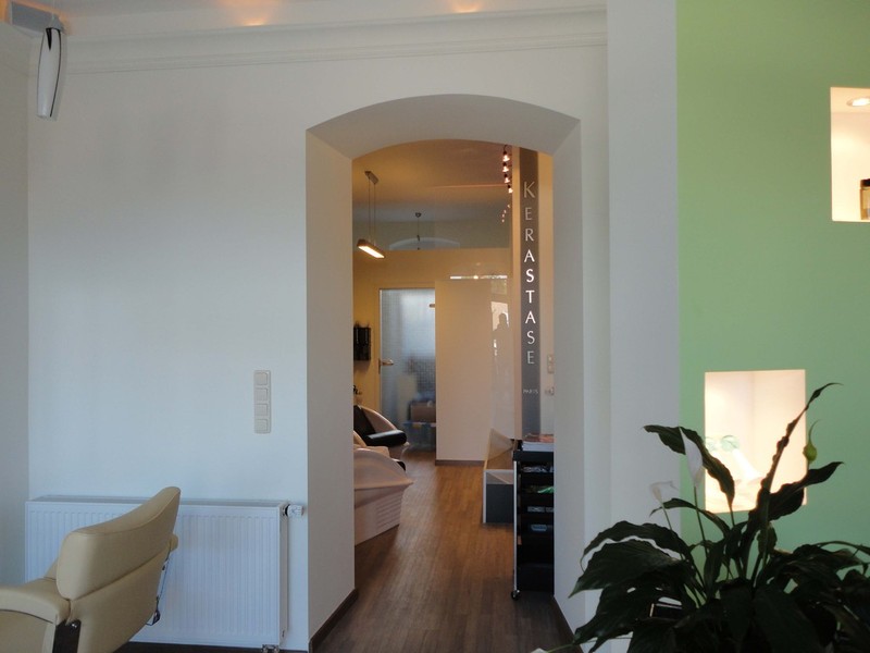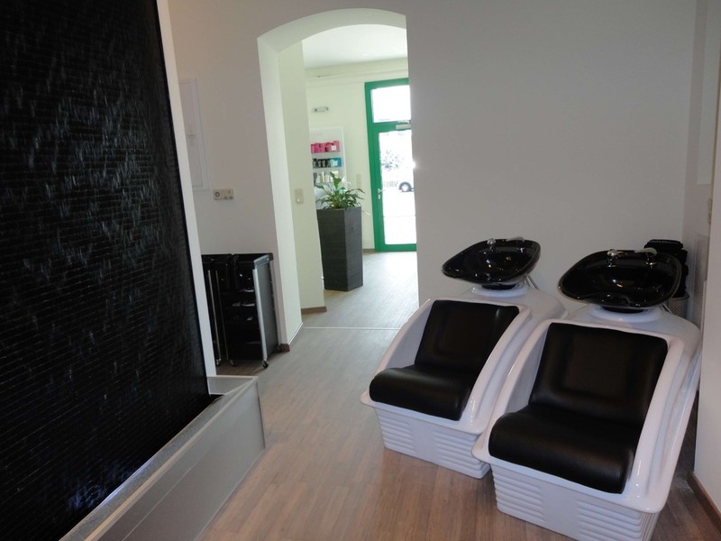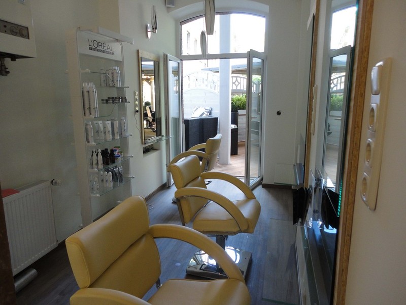 Der Eingangsbereich mit 6 Schneideplätzen ist voll klimatisiert und bietet, zusammen mit Wasserwänden aus frei fallendem Wasser, speziell für ältere Herrschaften ein angenehmes Raumklima auch an heißen Tagen. Der zweite Bereich mit 3 Waschplätzen und 3 weiteren Schneideplätzen bietet das natürliche angenehme Klima eines Sandstein - Jugendstil Hauses. Der dritte Bereich auf der Terrasse ist in der Freiluftsaison nutzbar.