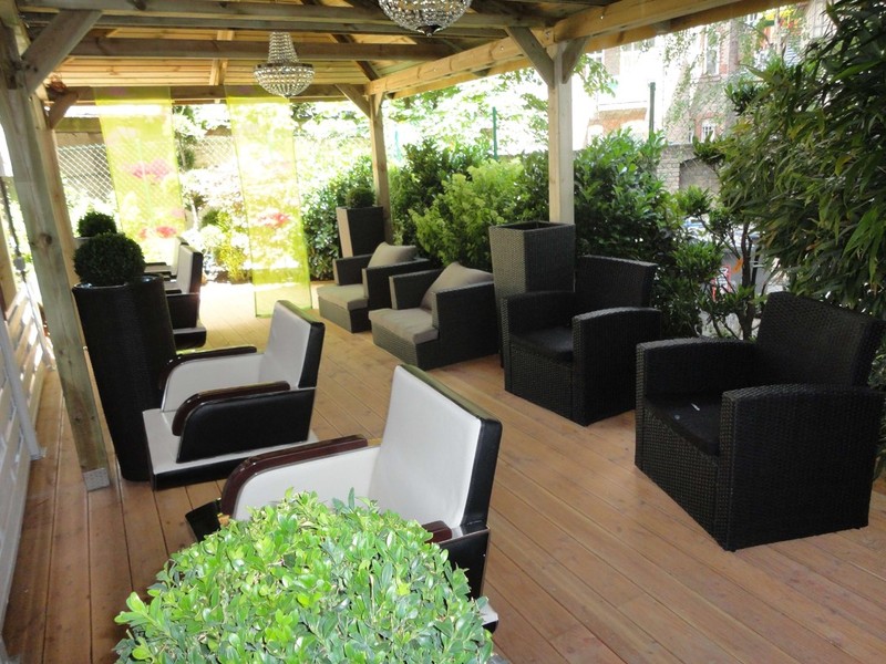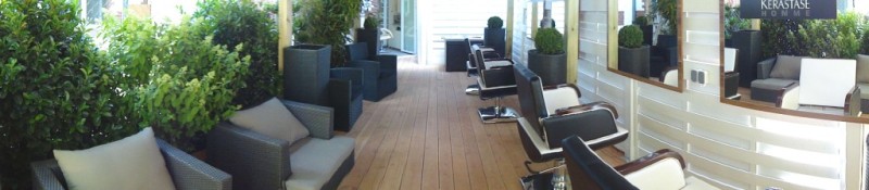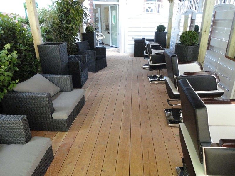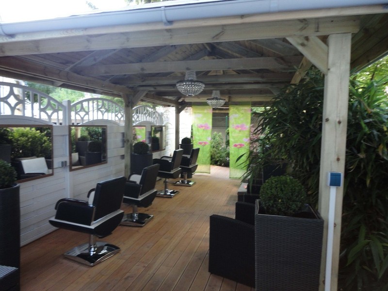 Die angeschlossene Außenterrasse bietet Ihnen die Möglichkeit, sich bei schönem Wetter die Haare in einem angenehmen Ambiente und Pflanzenumgebung schneiden und pflegen zu lassen